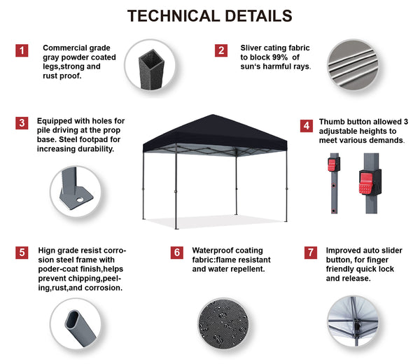No tools required, could be set up by 1 or 2 people. The latest thumb button release levers technology, makes set-up and close real safe, comfortable and reliable. Three height positions for your choice, clearance height from 6.4ft, 6.7ft to 7ft. Peak height from 10.5ft, 10.8ft to 11.1ft. Just adjust it to your expected height.