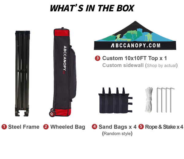 Package includes 1 premium canopy frame + 1customized top + 1 pure top+roller bag + 4 weight bags+ 4 ropes+ 4 stakes. 1 year after-sale protection for frame, 6 months after-sale protection for fabrics and accessories.