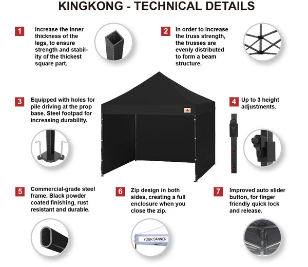 Special thicken full steel structure, premium grade 1.77'' (45 mm) hexagon shaped legs with hammertone powder coated finishing. Strong, Commercial and Rust Resistance. Build to withstand 50km/h of the strong wind. Your canopy will be the most durable and professional one in the market, definitely stand out from the crowd in Market stall/Market Trade Show.