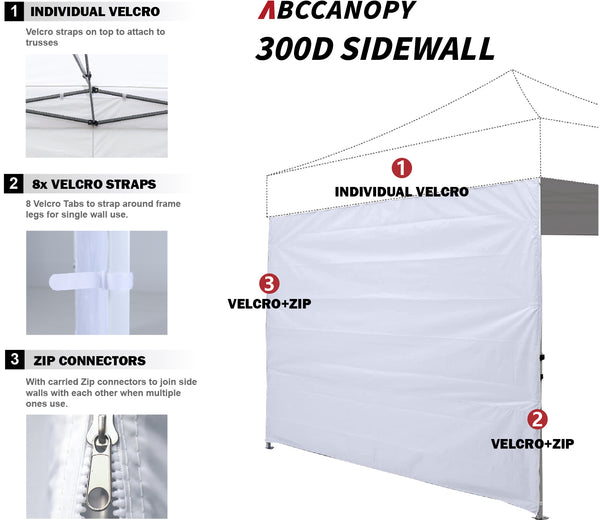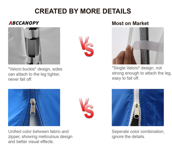 Sliver coated 300D PU polyester with CPAI-84 fire retardant certification, block 99.99% UV rays. Stitching lines are all seam sealed to prevent water penetrate from seams. 100% Waterproof. Steel D Rings on each corner, easy to use a rope to secure your canopy. Velcro straps on each valance to keep the canopy stick on the frame. Stable in the wind.