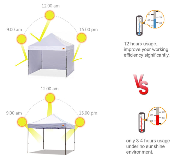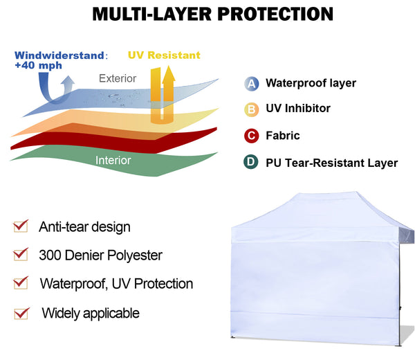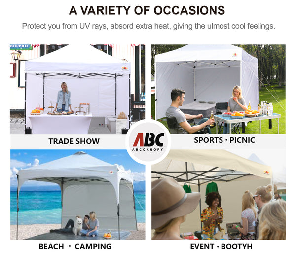 No tools required, could be set up by 1 or 2 people. The latest thumb button release levers technology, makes set-up and close real safe, comfortable and reliable. Three height positions for your choice, clearance height from 6.4ft, 6.7ft to 7ft. Peak height from 10.5ft, 10.8ft to 11.1ft. Just adjust it to your expected height.